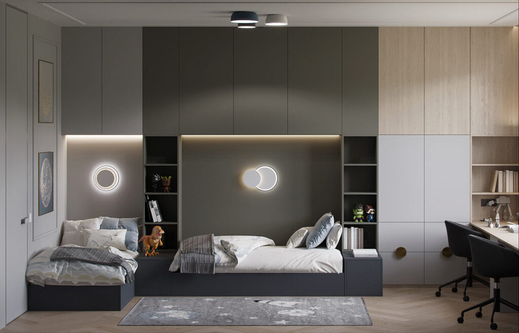 深藍(lán)灰色主題也在兒童房內(nèi)形成了有效的調(diào)色板,尤其是與空間主題裝飾搭配時。在這里,定制的兒童床在日食壁燈下照明,周圍環(huán)繞著珍貴的儲物柜。一個定制的雙工作區(qū)為家庭作業(yè)做好準(zhǔn)備。時尚的桌椅和黃銅抽屜把手營造出高端外觀。