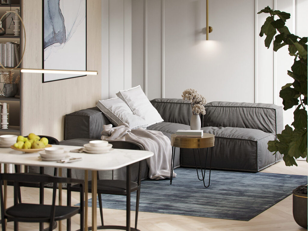在這間 79 平方米的公寓中,藍(lán)色調(diào)被柔和成喜怒無常的藍(lán)灰色元素。小組合沙發(fā)上的白色墻壁、天花板和白色散布墊輕輕地平衡了調(diào)色板。面板成型采用經(jīng)典優(yōu)雅的方法。