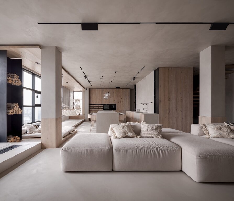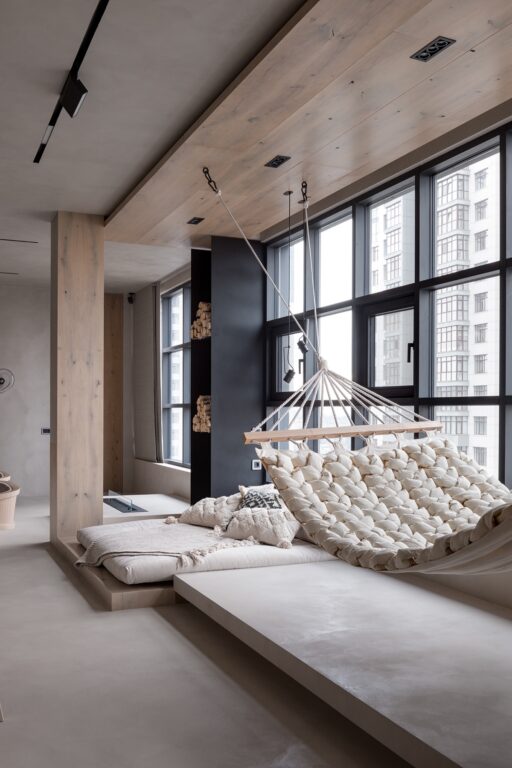 黑色窗框與乳白色的淺色內(nèi)飾材料形??成鮮明對比。一個黑色的木頭商店在窗格之間穿行,并在凸起的平臺和休息室之間形成了一個短暫的分隔。