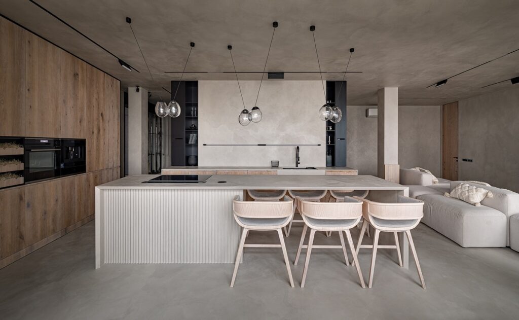 廚房在開放式布局的后面拉成一個 L 形的裝置,在其中心設(shè)置一個用餐島。一個地球吊燈三重奏下降到烹飪爐灶和休閑用餐點六把現(xiàn)代餐椅整齊地掠過臺面下方,以保持光滑的線性。紅酒儲藏架與集成烤箱和咖啡機(jī)切割成一條水平線。