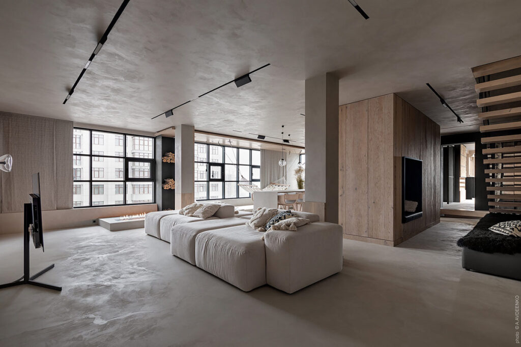 大多數(shù)沙發(fā)座椅都集中在電視上,電視只是安裝在一個單獨的電視架上。無縫的微水泥地板增加了空間感,并與天花板的開闊形成了材質(zhì)的鏡子。沿著走廊,地板升起進(jìn)入第二個接待室的入口。