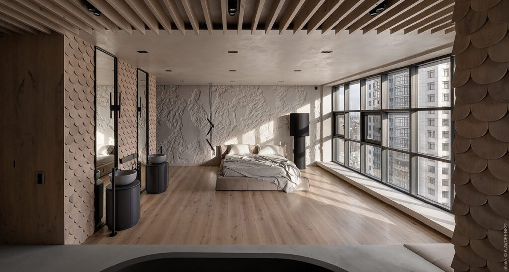 板條木天花板為寬敞的臥室設(shè)計增添了韻律。破舊的混凝土臥室背景墻為通風(fēng)的臥室方案帶來了深度、紋理和自由形式的圖案。一盞不尋常的落地?zé)魹樵摲桨傅臏\色調(diào)增添了濃重的黑色調(diào)。