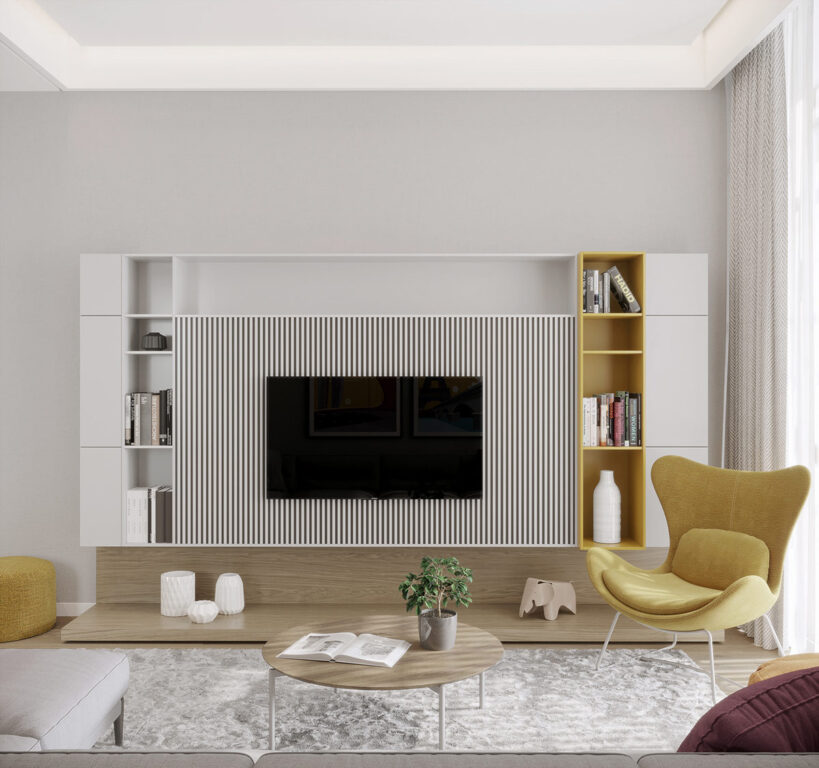 舒適的電視室采用豪華的藍(lán)色沙發(fā),為中性的灰色和白色方案增添了色彩斑斕的色彩。一個小的黃色赭石坐墊凳增加了一個大膽的對比時刻。在這個陽光明媚的黃色休息室空間,電視架包括一個有趣的黃色書柜,以改變布置。旁邊放置了一張黃色的躺椅,以夸大色彩效果。具有里程碑意義的藝術(shù)版畫賦予空間一種度假氛圍,喚起對過去旅行的回憶,并激發(fā)未來冒險的計(jì)劃。