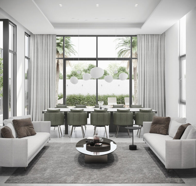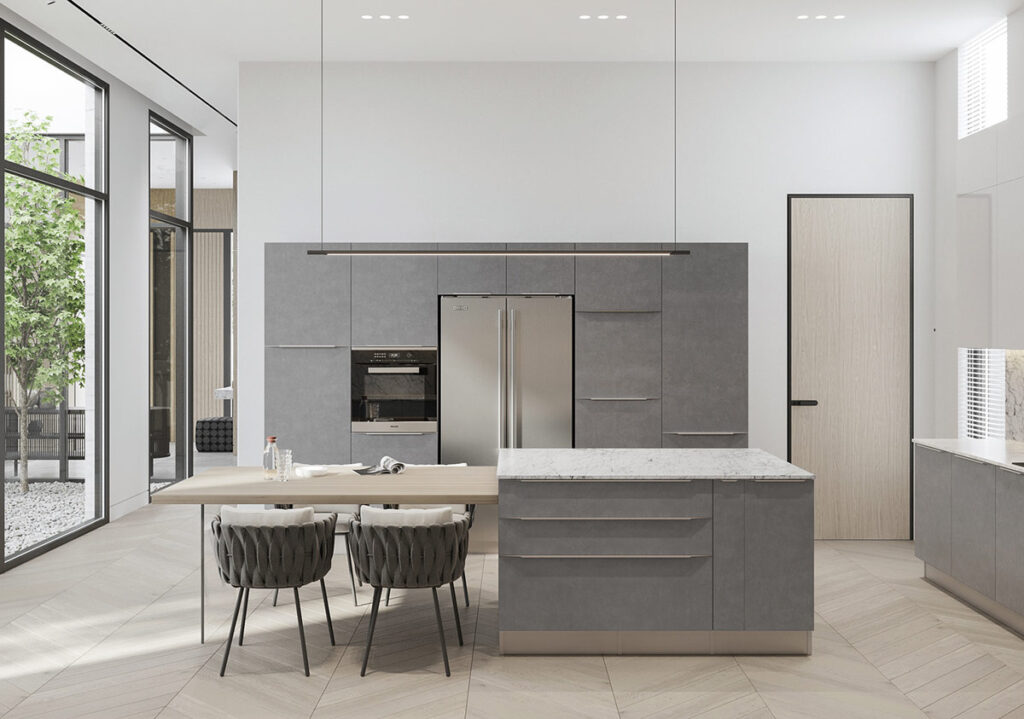 餐廳吊燈沿著正式餐廳的長度分組,形成浮動的雕塑特色。Sage餐椅與綠色花園景觀柔和融合。家里還有第二個用餐區(qū),是豪華廚房的一部分。四把設(shè)計(jì)師餐椅拉到一個方形餐桌延伸部分,該延伸部分被標(biāo)記在廚房島的一側(cè)。淡灰色的單元以 L 形布置提供了大空間的其余部分。