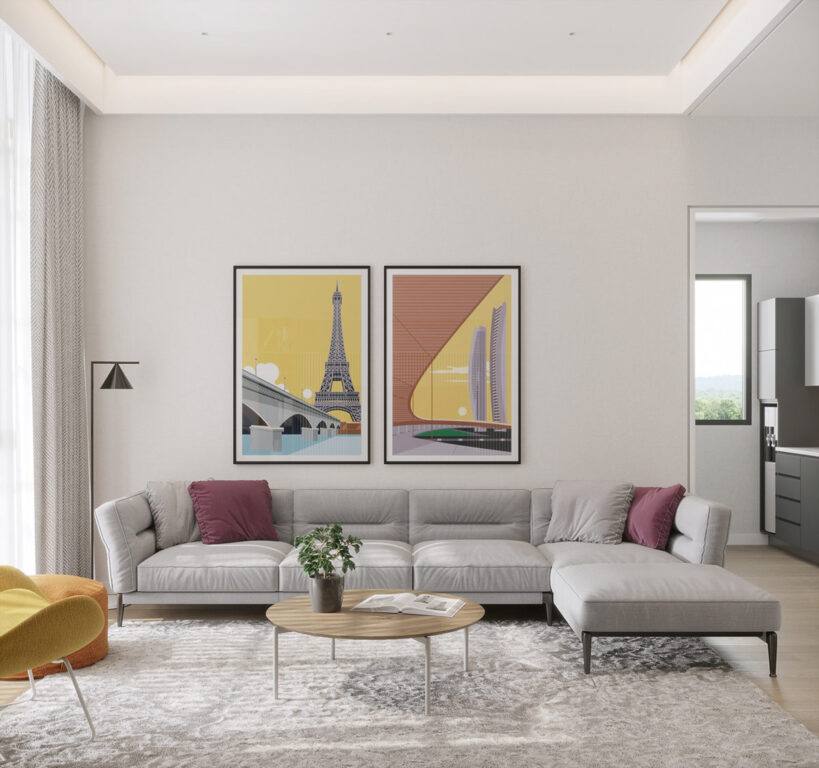 在這個以灰色和白色為基礎(chǔ)的涼爽客廳方案中,綠色重點(diǎn)椅子與顏色匹配的散布靠墊相連。綠色的沙發(fā)以自然的能量提升了中性的環(huán)境。珊瑚花卉藝術(shù)品為焦點(diǎn)墻增添了更明亮的流行元素。黑色玻璃圓形咖啡桌點(diǎn)綴在休息區(qū)的中心,在一疊咖啡桌書下方。一件黑白藝術(shù)品與深色圓形圖案相呼應(yīng)。
