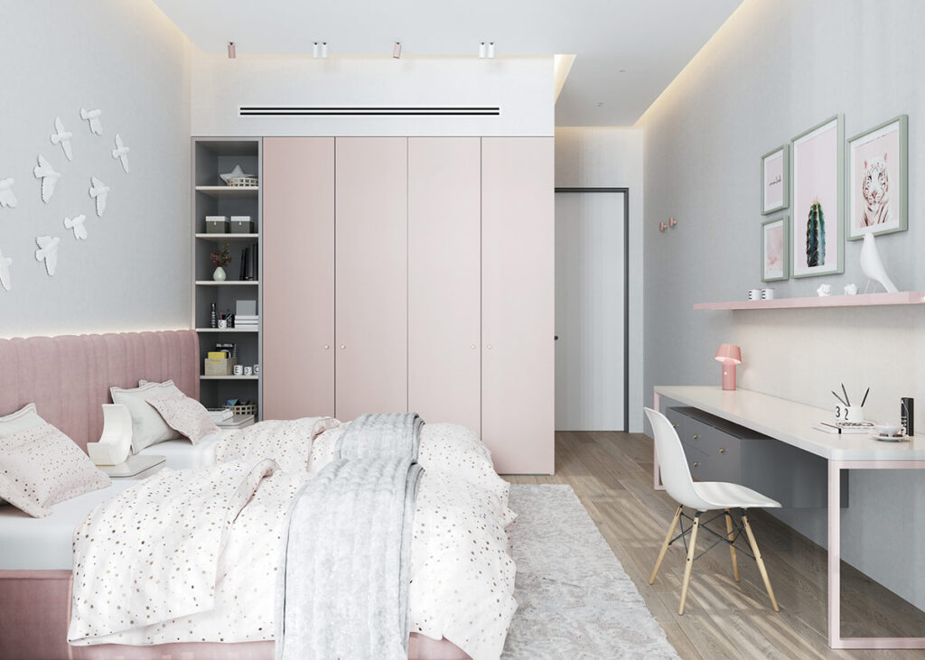 這間共享的粉紅色臥室是一個異想天開的空間,一群鳥兒在發(fā)光的月亮上翱翔。淡粉色的壁櫥被嵌入式周邊燈柔和地照亮。粉色藝術(shù)版畫、粉色壁架和粉色臺燈與粉色和白色兒童書桌相得益彰。