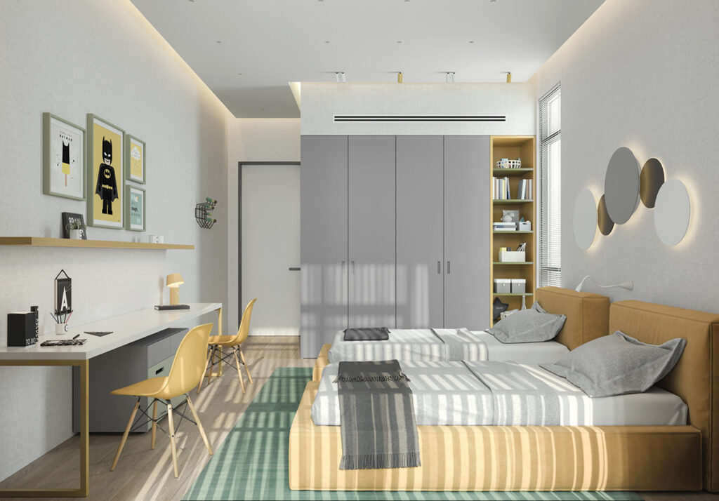 兩張黃色的床由一個長長的現(xiàn)代壁燈架起。在兩張單人床的腳下,一個雙人工作區(qū)延伸了房間的寬度。書桌抽屜位于死角以均勻劃分區(qū)域,共享架子利用墻壁空間。超級英雄藝術(shù)和勵志名言使可愛的孩子們裝飾。