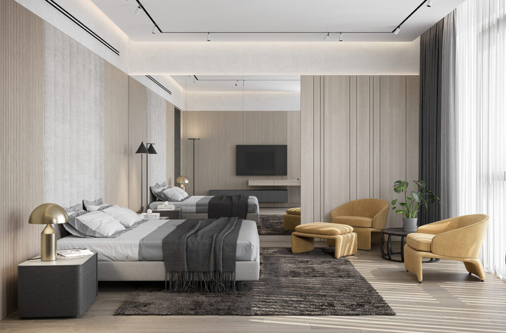 在主臥套房中,現(xiàn)代臥室的椅子和配套的腳凳增添了溫暖的黃油黃色觸感。金色的環(huán)礁燈與椅子的黃色色調(diào)相得益彰。