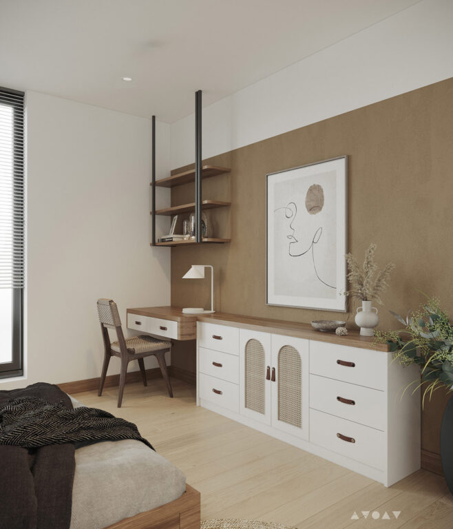在主臥室內(nèi),拱形圖案被換成了類似平滑的賽道形狀元素的峰頂。藤條背襯的跑道剪裁讓床邊的衣櫥設(shè)計(jì)時(shí)尚。天然編織地毯在地板上呈現(xiàn)出圓潤(rùn)的色調(diào),以平衡床另一側(cè)的圓形梳妝鏡。另外兩個(gè)藤背柜門切換回拱形設(shè)計(jì),以適應(yīng)他們的身材矮小。