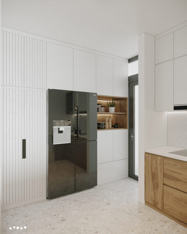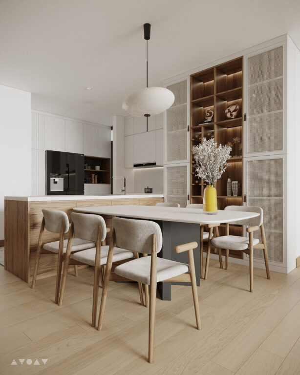 進(jìn)入廚房餐廳空間,現(xiàn)代餐桌和椅子套裝在吊燈下方延伸。桌子靠在廚房島臺(tái)上,讓用餐者可以輕松地與廚師互動(dòng)。白色和木質(zhì)廚房定制柜體在房間周圍營(yíng)造出干凈溫暖的美感。光滑的黑色冰箱冰柜增添了大膽的點(diǎn)綴,與集成烤箱和黑色廚房配件相結(jié)合。