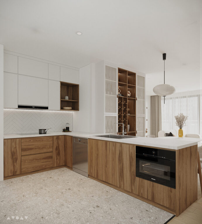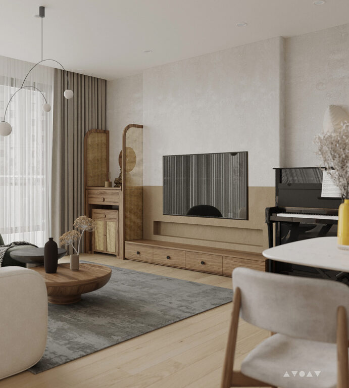 一個(gè)引人注目的拱門位于這個(gè)現(xiàn)代住宅的客廳中央,在小沙發(fā)后面形成了一個(gè)優(yōu)雅的背景。沙發(fā)后面的拱形造型實(shí)際上是一個(gè)緊湊的工作區(qū),嵌入一排定制的儲(chǔ)物柜中。迷人的白色和木材是溫暖地組合配色。在客廳地毯的另一邊,一張拱形靠背的躺椅增添了一條互補(bǔ)的曲線。兩個(gè)圓形茶幾組合在客廳中央優(yōu)雅的拱形枝形吊燈下。圓形藤條屏風(fēng)與珍貴的佛壇接壤,將其與電視墻和媒體柜輕輕隔開。
